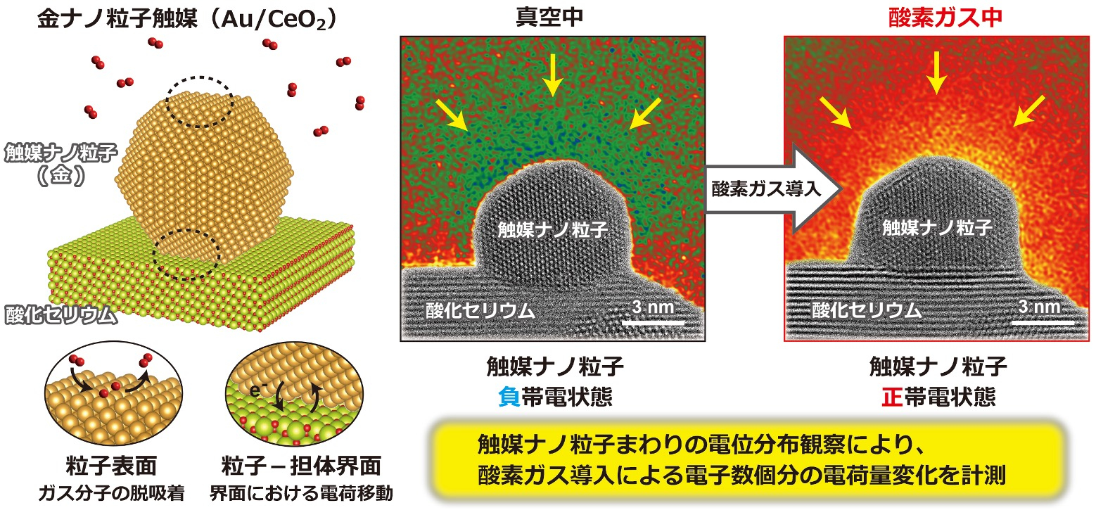 九州大学大学院工学研究院の麻生亮太郎准教授、村上恭和教授、佐野弘貴氏(博士前期課程)、九州大学超顕微解析研究センターの玉岡武泰助教(現:株式会社東レリサーチセンター)、大阪大学産業科学研究所の吉田秀人准教授、九州大学大学院総合理工学研究院の永長久寛教授、北條元准教授、大阪大学大学院情報科学研究科の御堂義博特任准教授(常勤)、株式会社日立製作所研究開発グループの谷垣俊明主管研究員らの研究グループは、高感度の電子線ホログラフィー※1と環境制御型透過電子顕微鏡法※2を組み合わせた手法により、実環境を模擬したガス雰囲気中で、酸化セリウム(CeO2)に担持(付着)した金(Au)ナノ粒子触媒の表面構造と帯電状態の変化を直接観察することに成功しました。観察の結果、酸素ガス導入時にAuナノ粒子表面が乱れ、負帯電が正帯電側へ変化することを発見しました。この変化は、ガスの導入と除去により可逆的に起こることから、表面構造と帯電状態の制御が可能であることを実証し、触媒設計の新たな指針を提示するものです。