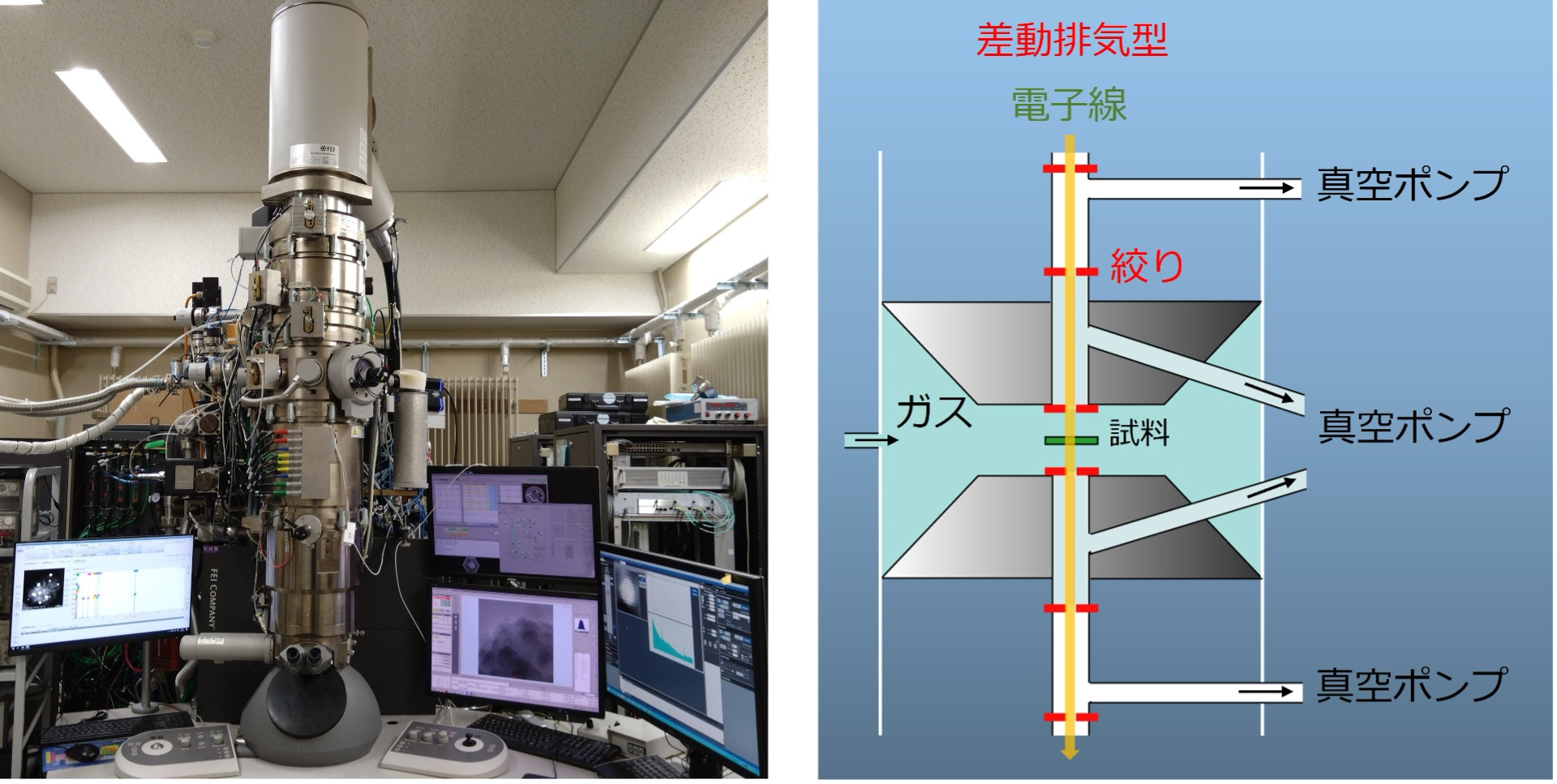 こうした背景のもと、九州大学、大阪大学、日立製作所からなる研究グループは、触媒ナノ粒子の構造および帯電状態を、触媒の実際の使用環境を模擬した酸化還元雰囲気下(酸化反応、あるいは還元反応を起こすガスが存在している状態)で、ナノスケール・単一粒子レベルで直接観察することに成功しました。これは、高感度の電子線ホログラフィーと環境制御型透過電子顕微鏡法(ETEM)(図1)を融合させた新たな観察手法によって実現されたものであり、従来技術では把握しきれなかった表面構造と帯電状態の関係を明らかにした点で画期的な成果です。