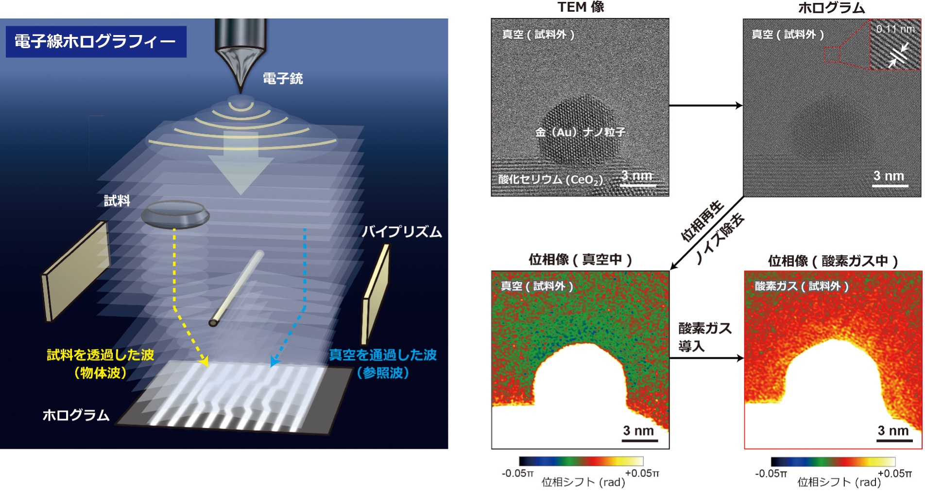 - 高感度の電子線ホログラフィーと環境制御型透過電子顕微鏡法の組み合わせにより、実環境を模擬したガス雰囲気中(ガスが充満している状態)で触媒ナノ粒子の表面構造や帯電状態の変化を直接可視化
