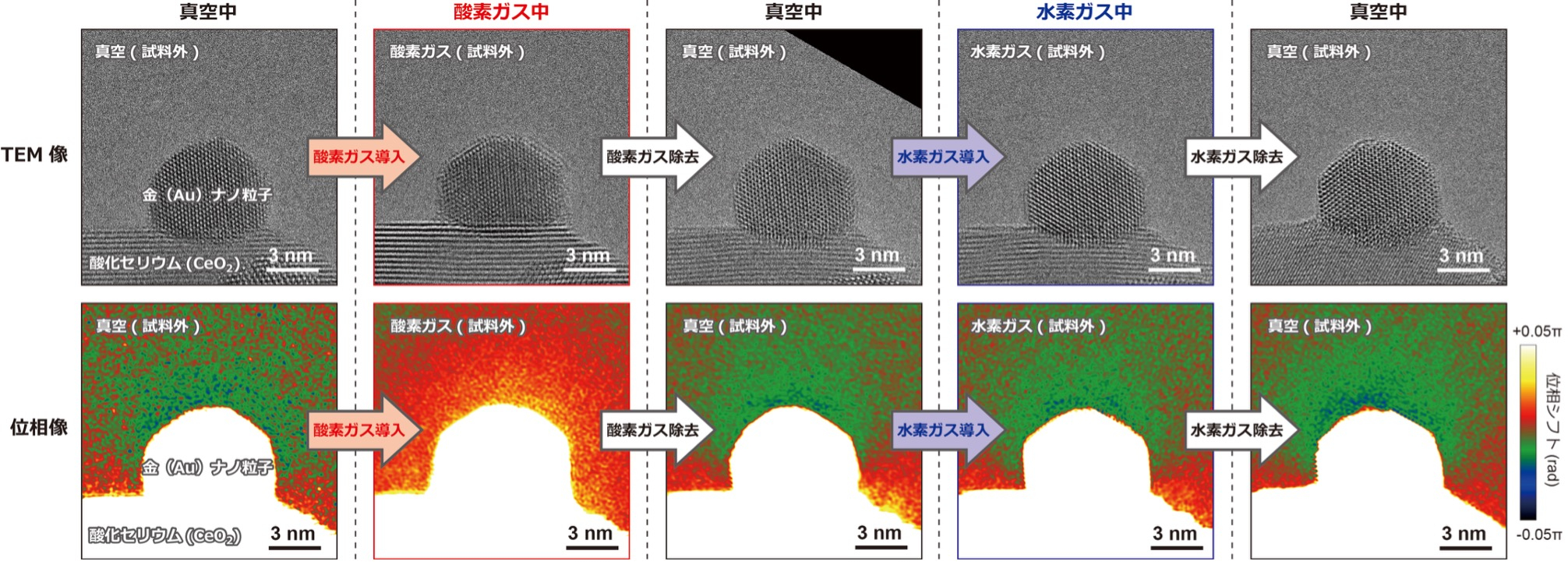 今回の研究では、こうした電子線ホログラフィー計測技術の高感度化を発展的に活用し、CeO2上に担持されたAuナノ粒子触媒における酸化還元雰囲気下での帯電状態と構造変化を「その場」でリアルタイム観察することを実現しました(図2)。酸化雰囲気として酸素ガスを導入した時には、Auナノ粒子表面で原子配列の乱れが進行し、同時に負に帯電していた粒子が数電子単位で正帯電へと変化する様子が捉えられました(図3)。この変化は可逆的であり、ガスの導入と除去によってAuナノ粒子の表面構造と帯電状態を制御できる可能性が示唆されました。一方、還元雰囲気として水素ガスを導入した場合には、真空中と比較して構造や帯電状態にほとんど差異は見られず、有意な変化は確認されませんでした。