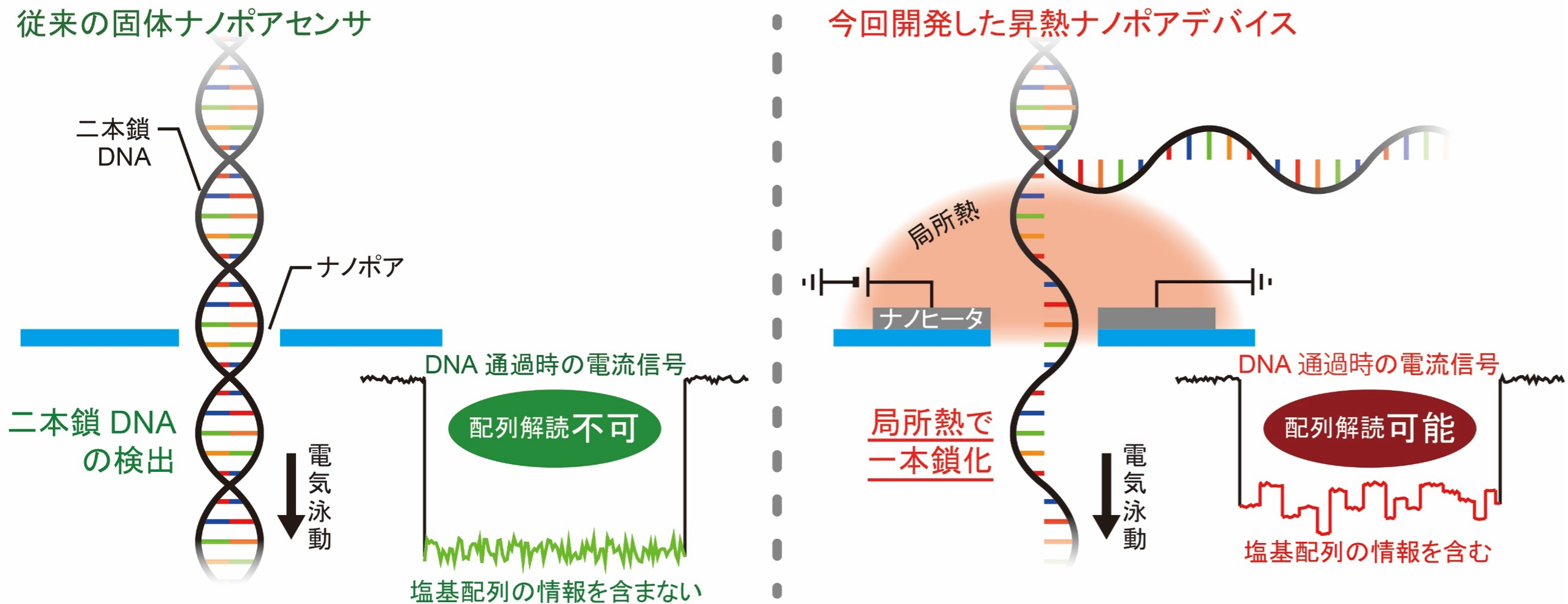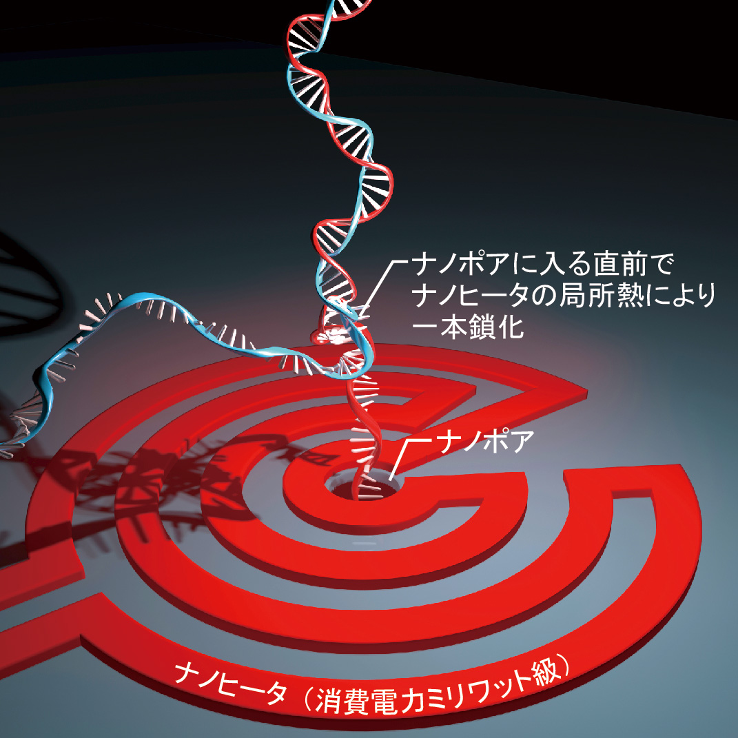 このデバイスは、毛髪の直径よりもはるかに小さい「ナノポア」という微小な孔のそばに、金属製の極小ヒータ(ナノヒータ)を内蔵したものです(図1)。このヒータに電気を流すと、ナノポア周辺のごく狭い空間だけを高温にすることができ、その熱でDNAの二重らせん構造をほどいて一本鎖の状態に変えることができます。そしてこの1本のDNAがナノポアを通過する際のイオン電流※2変化を調べることで、DNAの塩基配列情報を高速に読み取ることが可能になります。