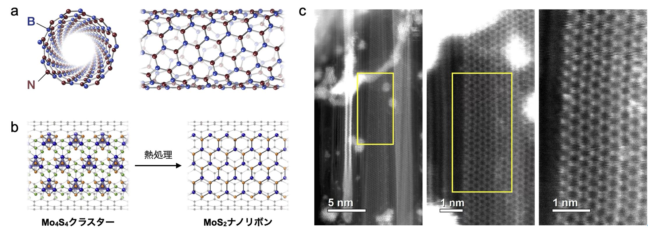 図1:BNナノチューブを反応場としたMoS2ナノリボンの合成 (a)BNナノチューブの構造モデル(b)無機分子(Mo₄S₄)の熱処理によるMoS₂ナノリボンの合成(c)MoS2ナノリボンの電子顕微鏡写真