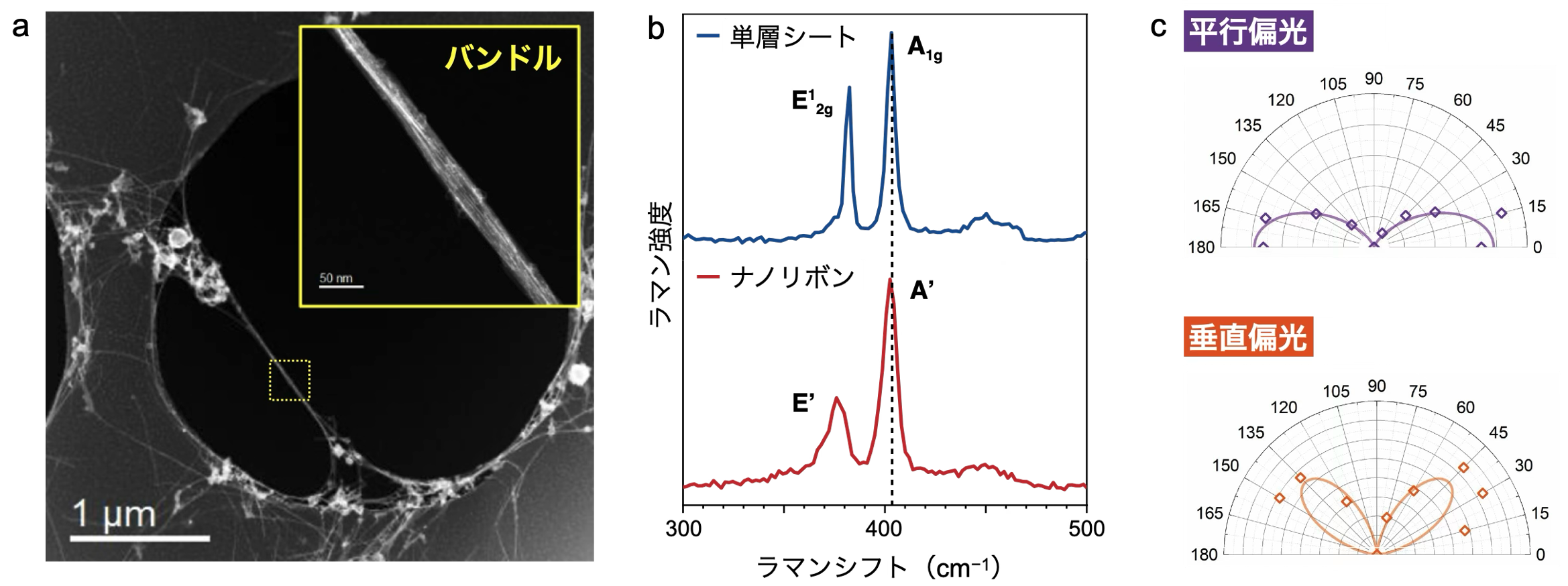 図2:ラマン分光で観測されたMoS2ナノリボンの光学異方性 (a)架橋されたMoS2ナノリボンのバンドル(束)の電子顕微鏡写真(b)MoS2ナノリボンのラマンスペクトル。面外振動(A1gやA’)のピークに対して面内振動(E12gやE’)のピークが相対的に大きくシフトしており、引っ張りひずみがかかっていることが示唆される。(c)角度分解偏光ラマンスペクトルの極座標プロット