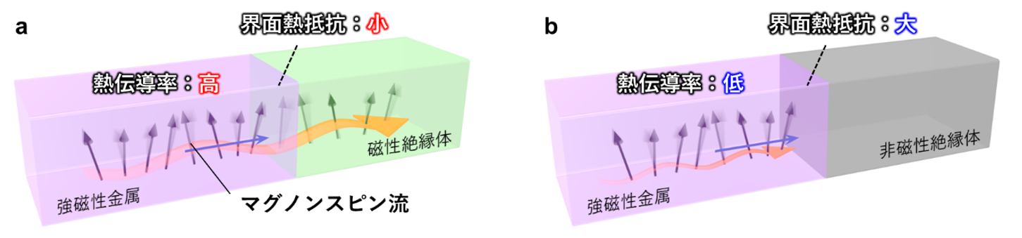 - 強磁性金属表面が加熱されると、内部にスピン流が生じます。このスピン流は磁性絶縁体が接合している場合には絶縁体内部まで伝搬しますが、非磁性絶縁体が接合している場合には絶縁体中にスピン流は注入されません。