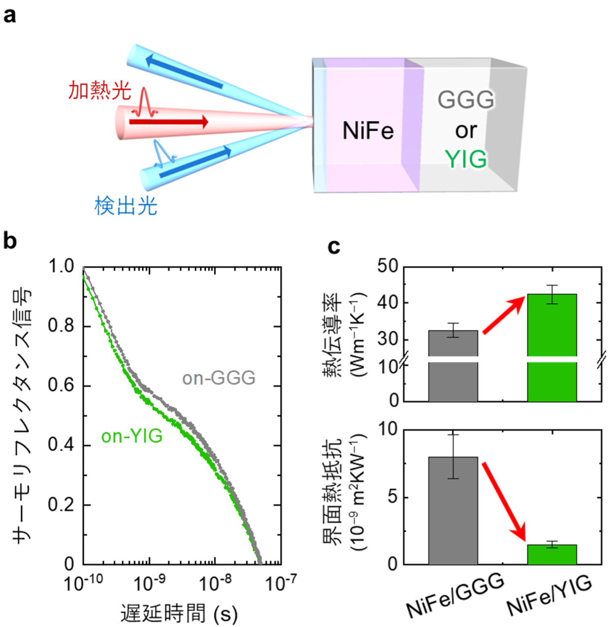 強磁性金属薄膜(CoFeやNiFe)とガーネット※4系絶縁体から成る積層構造を作製し、室温下で時間領域サーモリフレクタンス※5(図2(a))という手法を用いて、薄膜表面をレーザーで瞬時に加熱しながらナノメートルスケールや界面での熱輸送特性を精密に評価しました。