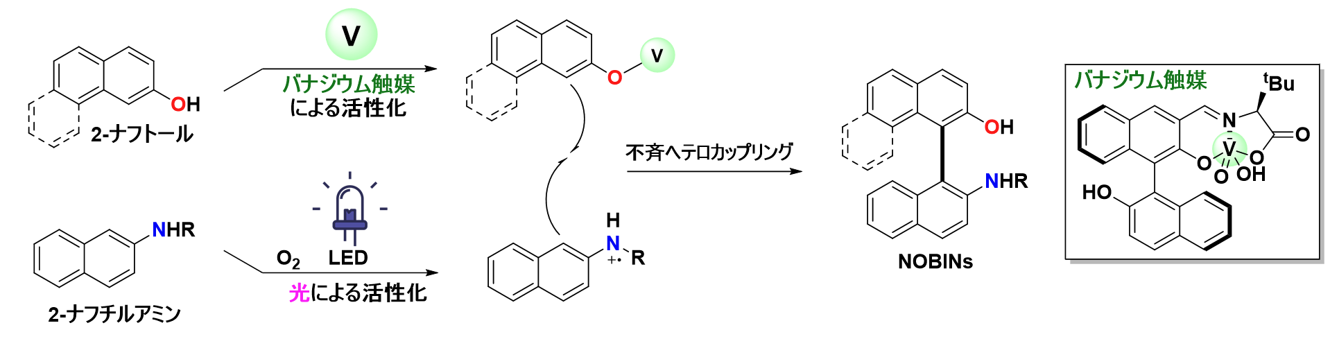 バナジウム触媒と光が奏でる新たな合成法 ―副生成物は水のみ!医薬品開発に有用なNOBIN分子のグリーン不斉合成―