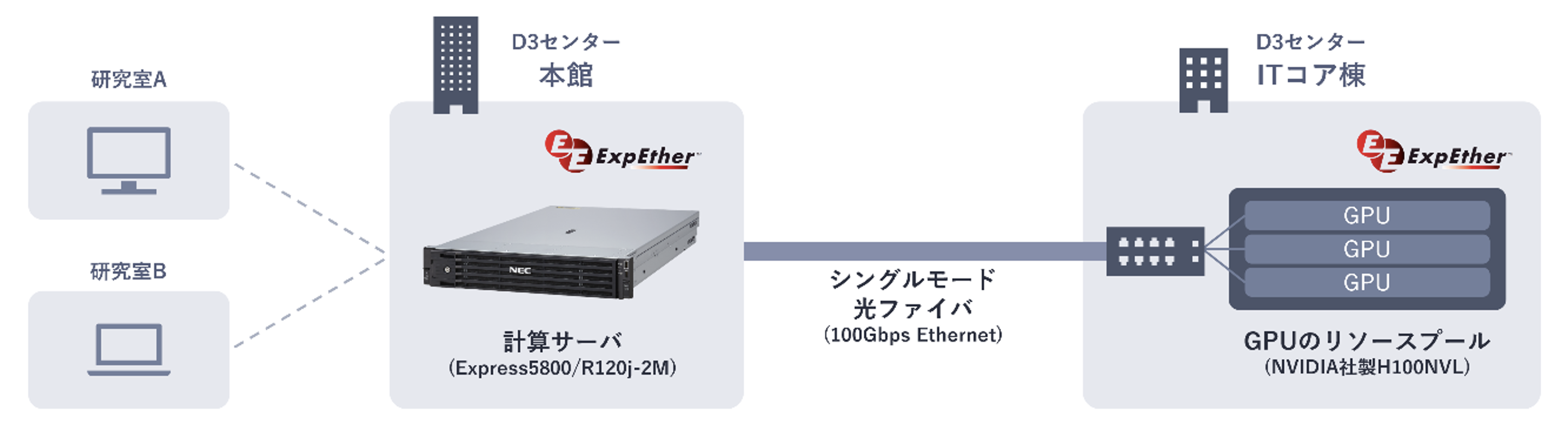 本実証は、大阪大学吹田キャンパス内のD3センターITコア棟にリソースプールとして設置されたGPU(NVIDIA社製H100NVL)と、本館に設置された計算サーバ(Express5800/R120j-2M)を、ExpEtherを活用して光ファイバー(100GbpsのEthernet)で接続します。この環境下で、GPUを利用するAIアプリケーションを中心に動作確認および性能検証を実施します。